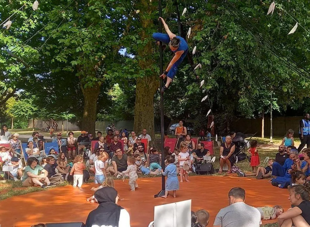 Mardi, la compagnie La Croisée des chemins proposait un spectacle interactif ouvert aux enfants âgés de 18 mois à 3 ans. Le parc de la Gironde offrait un cadre idéal à cette scène installée autour d’un mât de cocagne.  Le côté participatif est original,