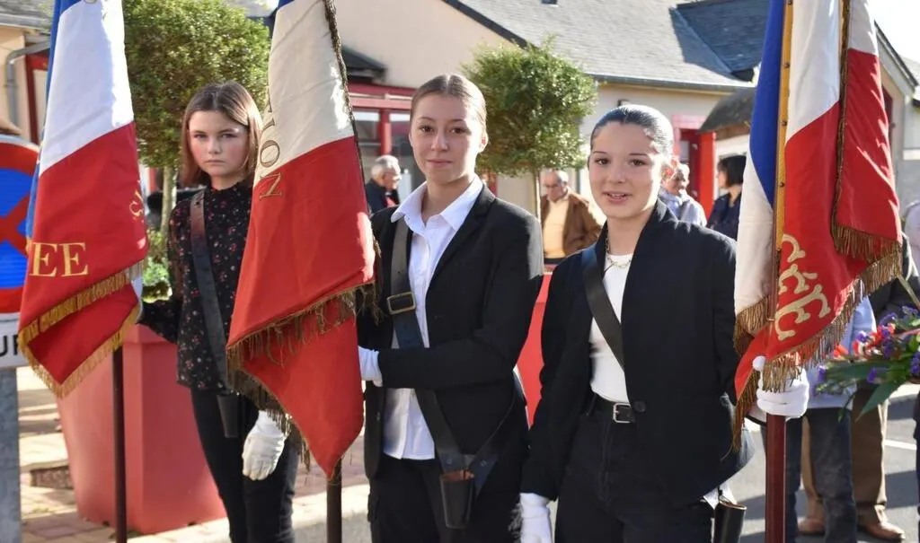 Trois adolescentes se sont portées volontaires en tant que porte-drapeaux lors de la commémoration de l’Armistice de 1918 au monument aux morts. Laurine Allard, Lilou Bouvier et Louane Valverde avaient manifesté leur envie, lors de la dernière commission jeunesse de la commune. Vendredi, elles ont pris leur rôle très au sérieux. © Ouest-France