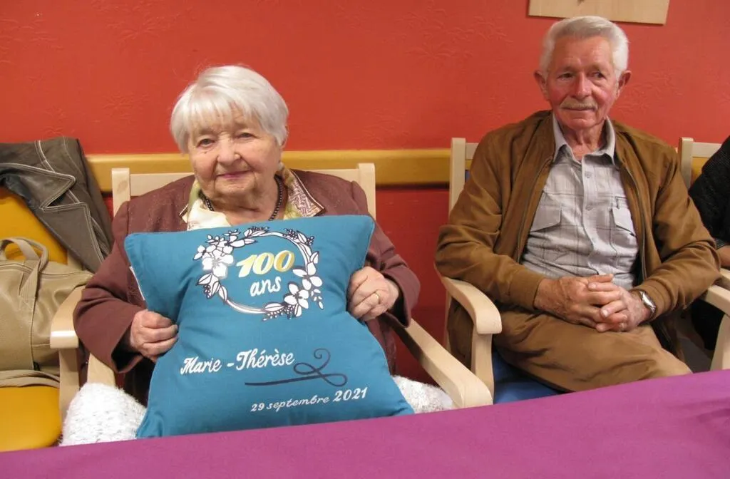 Pour son centième anniversaire, le 29 septembre, Marie-Thérèse a été accueillie, avec toute sa famille, au son de l’accordéon du groupe Accordéon bonheur, qui joue La java bleue, et que tous reprennent en chœur. C’est une ambiance de fête générale rare pour célébrer une centenaire pétillante de joie.