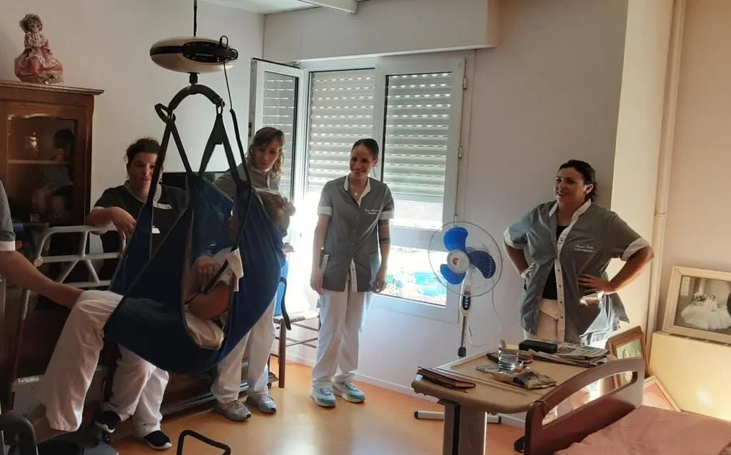 Le personnel soignant de l’Ehpad de La Chanterie a suivi une formation spécifique pour la manipulation des rails de transfert. © Le Maine Libre