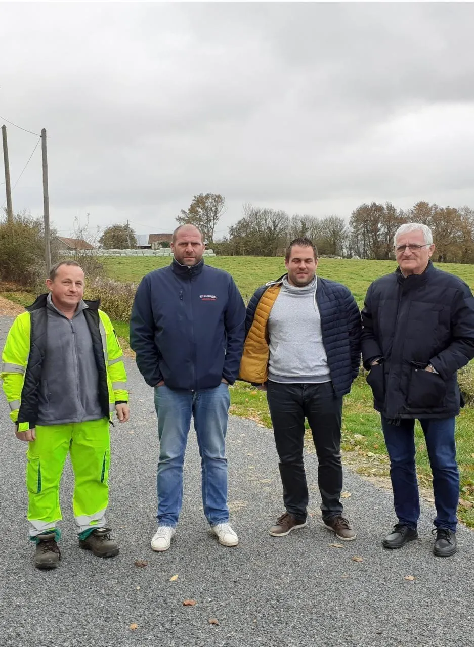 M. Léguillon, des services techniques de Coulans, M. Savary d’Eurovia, M. Choplin, technicien de Loué-Brûlon-Noyen communauté, et le maire, Michel Briffault. © Ouest-France