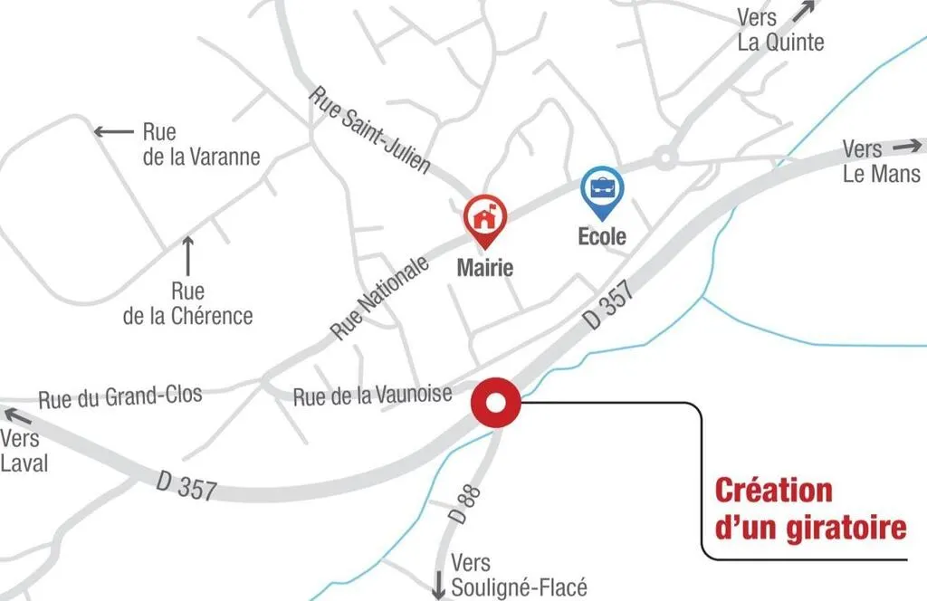 Actuellement, le Conseil départemental de la Sarthe mène un chantier de sécurisation du carrefour situé à l’intersection de la RD 357 (route de Laval) et la RD 88 (route de Souligné-Flacé). Ce projet concerne la création d’un giratoire ainsi que plusieurs aménagements spécifiques. Ces travaux seront réalisés en deux temps, du 26 octobre au 17 décembre 2021, puis du 14 février à fin mars 2022. Ces dates peuvent évoluer en fonction des conditions météorologiques. Des travaux entièrement financés par le Conseil départemental à hauteur de 950 000 € TTC.