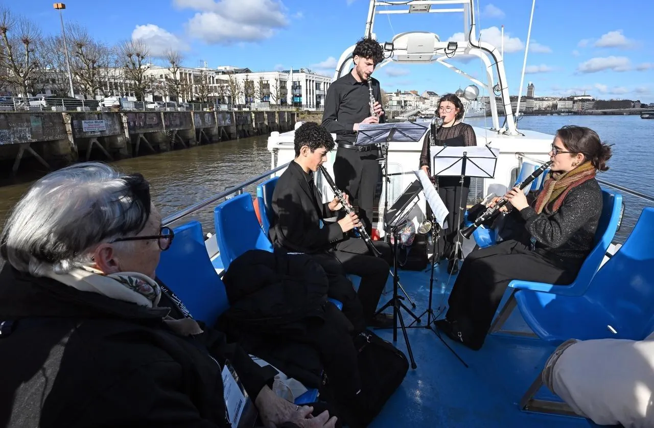 Les quatre clarinettistes, Maëlys Brinette, Kolia Parriente, Dante Di Rosa et Eliott Viola Spaeter, étudiants au conservatoire de Nantes, ont pris place sur le pont-terrasse du bateau-navette et se sont mis à jouer. Les passagers ont apprécié ce moment inattendu et cette traversée inédite pour rejoindre Trentemoult, à Rezé, sur la rive sud. C’est par ce concert inédit qu’a été donné le coup d’envoi de la Folle journée, qui se déroulera du mercredi 28 janvier au dimanche 1er février à Nantes.
