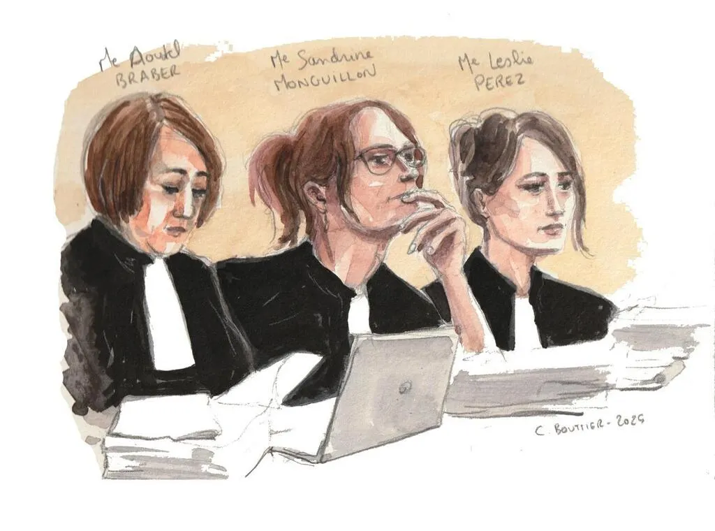 Les trois avocates de la défense dans le procès du coup de feu mortel sur l’aire d’accueil des gens du voyage à La Ferté-Bernard. © Dessin Charlotte FOISSEAU-BOUTTIER