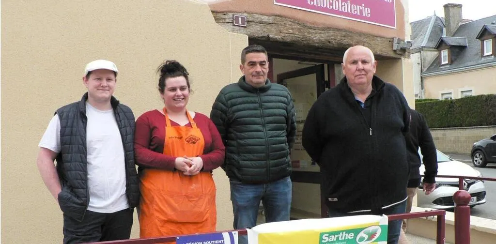 De gauche à droite : Charles Boul, boulanger; Lynn Lambert, vendeuse; Ludovic Bannon; conseiller municipal et Patrick Manuel, maire. © Ouest-France