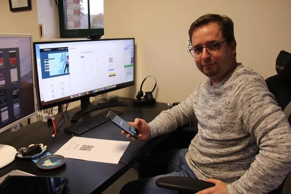 Dollon, dimanche 25 octobre 2020. Stéphane Biguet, dirigeant de la société Cerivan, scanne le QR code avec son smartphone pour ouvrir la page d’inscription. © Le Maine Libre