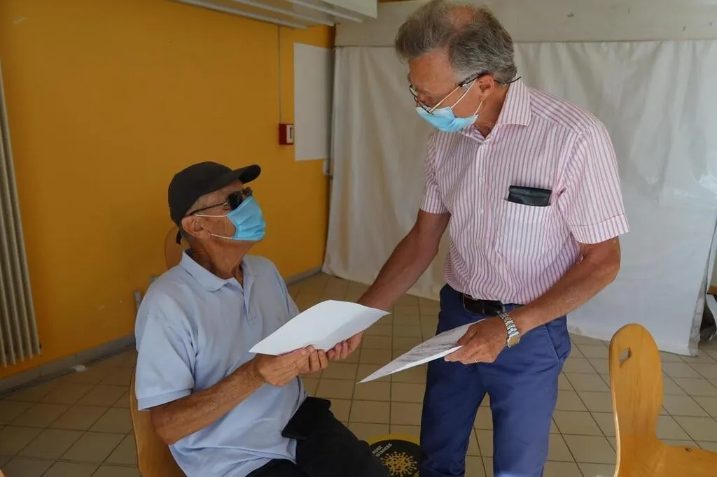 Jean reçoit son attestation de troisième dose de vaccin, des mains d’un médecin du centre de vaccination de Coulaines. © Photo Le Maine Libre