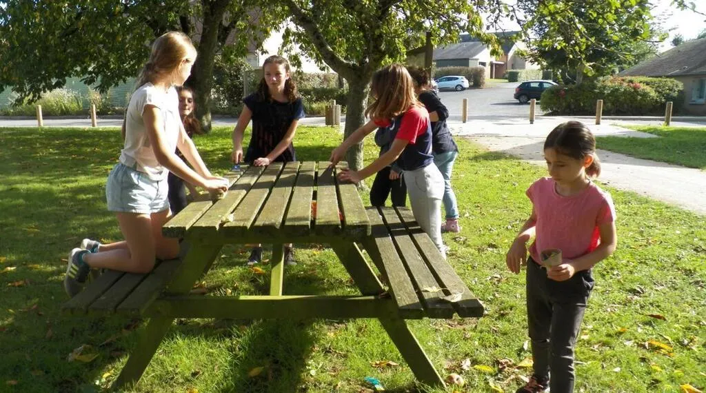Grattage et démoussage des tables de pique-nique dans le parc de la mairie pour les plus jeunes. © Le Maine Libre