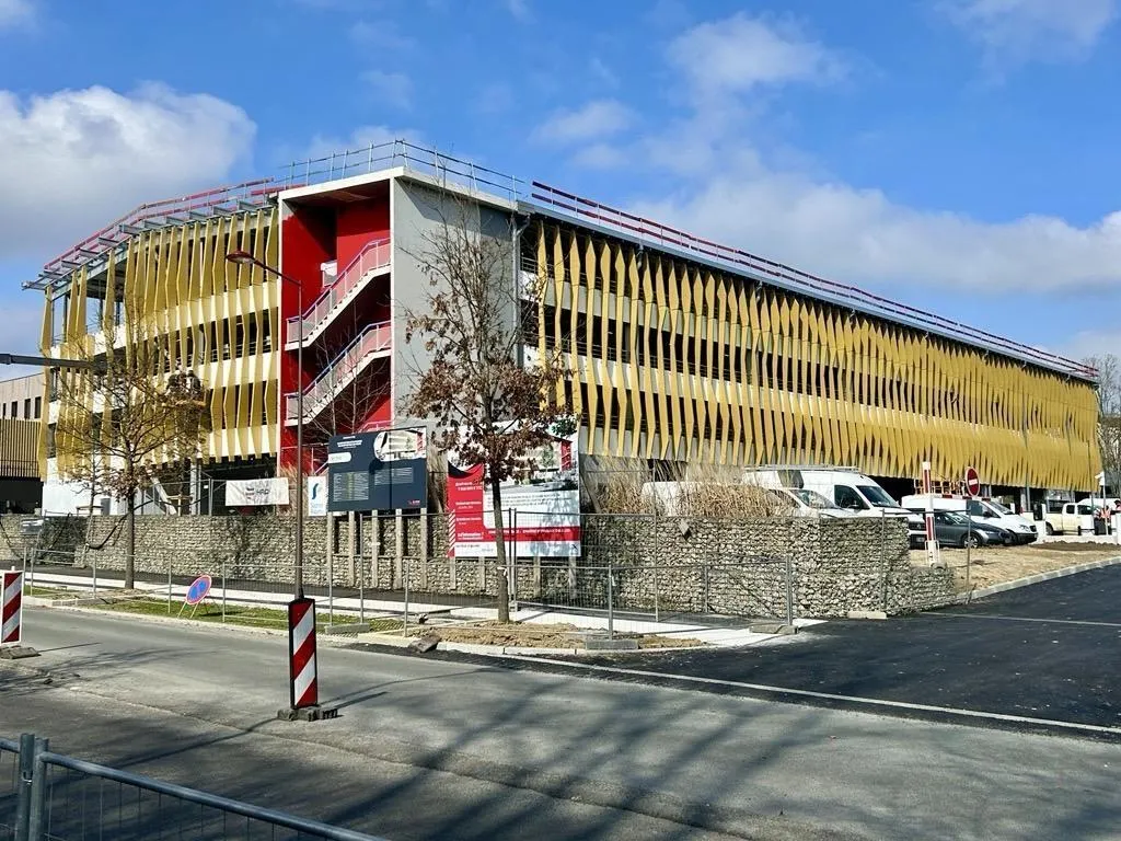En cette mi-mars 2025, au Mans (Sarthe), les travaux de finition du parking silo, à proximité du centre de cancérologie et de l’hôpital, prennent fin. Il comprendra 423 places de stationnement, payantes, réparties sur quatre niveaux.