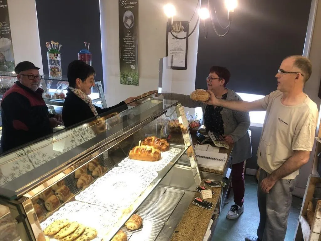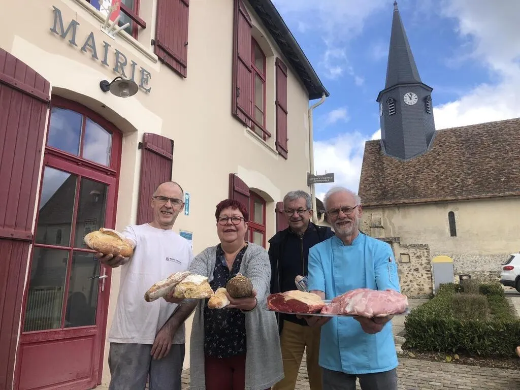 Neufchâtel-en-Saosnois, mardi 25 avril 2023. De gauche à droite : Dominique et Catherine Deschamps les boulangers, Jean-Denis Guibert le maire, et Raymond Fromentin le boucher. À Neufchâtel, les commerçants sont combatifs ! © Le Maine Libre