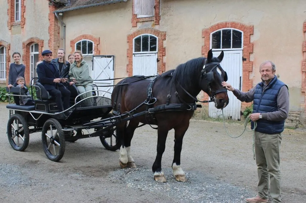 Avant le départ d’une promenade en calèche, Daniel Boittin, aux commandes avec ses passagers et Patrice Favier, maire, à droite. © Le Maine Libre