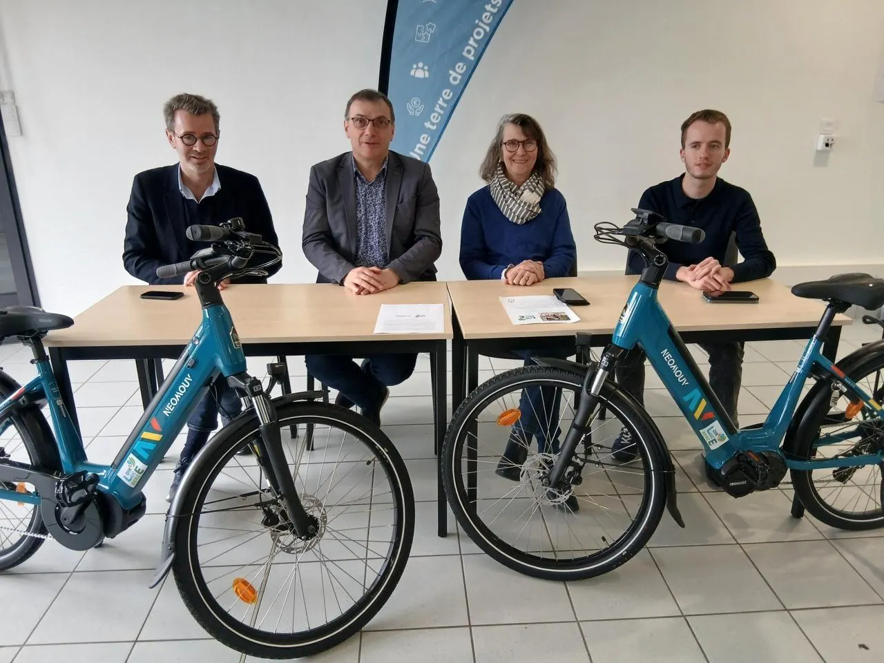 De g. à dr : Olivier Goupil, Hervé Roncière, Galiène Cohu et Matteo Charcellay (commercial chez Néomouv). © Le Maine Libre