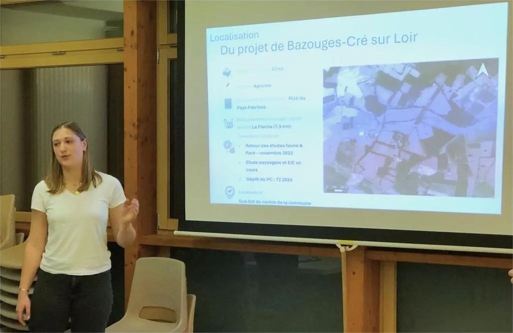 Camille Vanier, chef de projet développement pour la société Photosol, a expliqué comment allait se présenter la structure qui pourrait être installée dans cette exploitation agricole. © Le Maine Libre