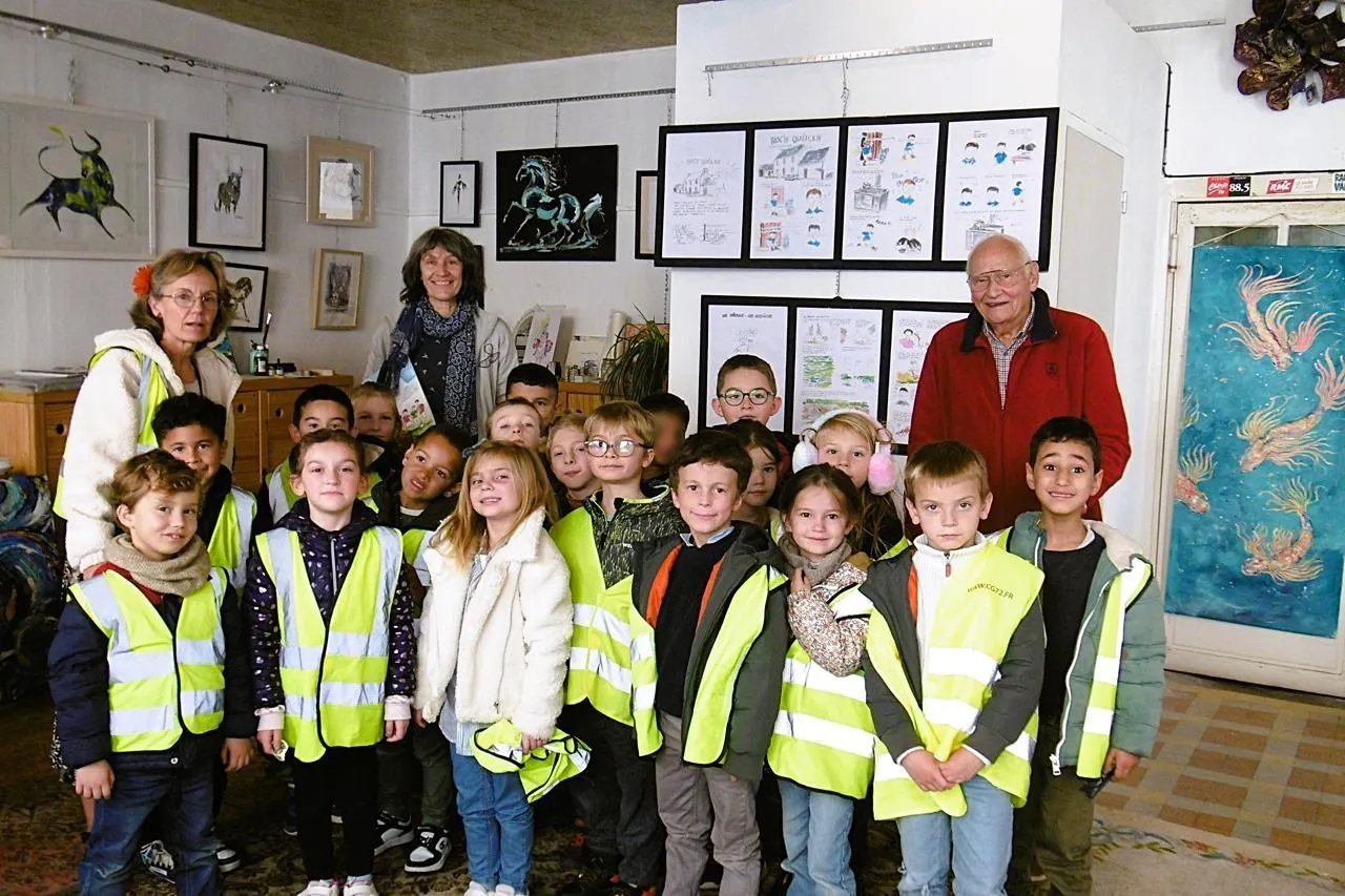 Dans le cadre de leur projet annuel consacré aux talents et aux métiers artistiques, les élèves de CP de l’école Saint-Thomas-d’Aquin à Mamers ont eu la chance de visiter, jeudi 13 novembre 2025, la galerie de l’artiste mamertine Véronique Lesage.