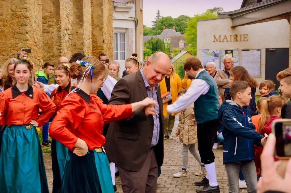 En mai 2018, les Allemands de Wewelsburg avaient proposé des danses folkloriques aux habitants, dont Jean-François Zalezny, le maire de Précigné. © Gilles Rousselet d’Esclavelles