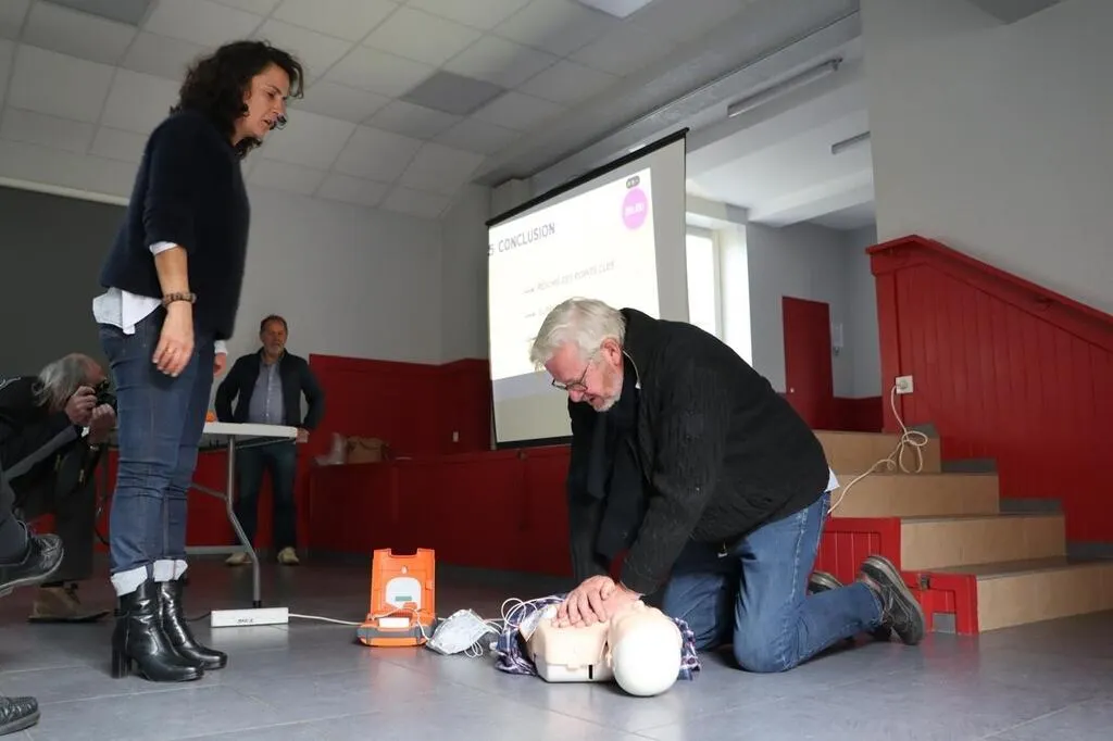 Christel Baldet a demandé aux participants à la réunion de venir tester le défibrillateur cardiaque sur un mannequin, lors de la réunion d’information, samedi 26 octobre 2024, dans la salle des fêtes de Juigné-sur-Sarthe. © Ouest-France