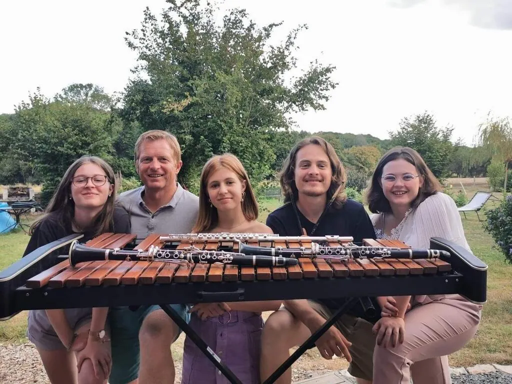 Celui-ci épouse Cécile qui, à ses moments perdus, taquine les cordes d’une guitare folk. De cette union naissent Pierre aujourd’hui 25 ans qui, dans un tel environnement apprend la batterie, Annaëlle 22 ans qui, tradition familiale oblige, se dirige vers la clarinette, Coline 20 ans qui préfère la flûte. La petite dernière Maud 16 ans choisit les percussions et le xylophone.