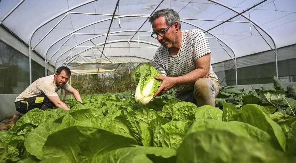 Saint-Célerin, jeudi 3 avril 2025. Ludovic Launay et Thomas Guéret, l’un des associés (au second plan) aux petits soins de leurs choux pé-tsaï. © Denis LAMBERT