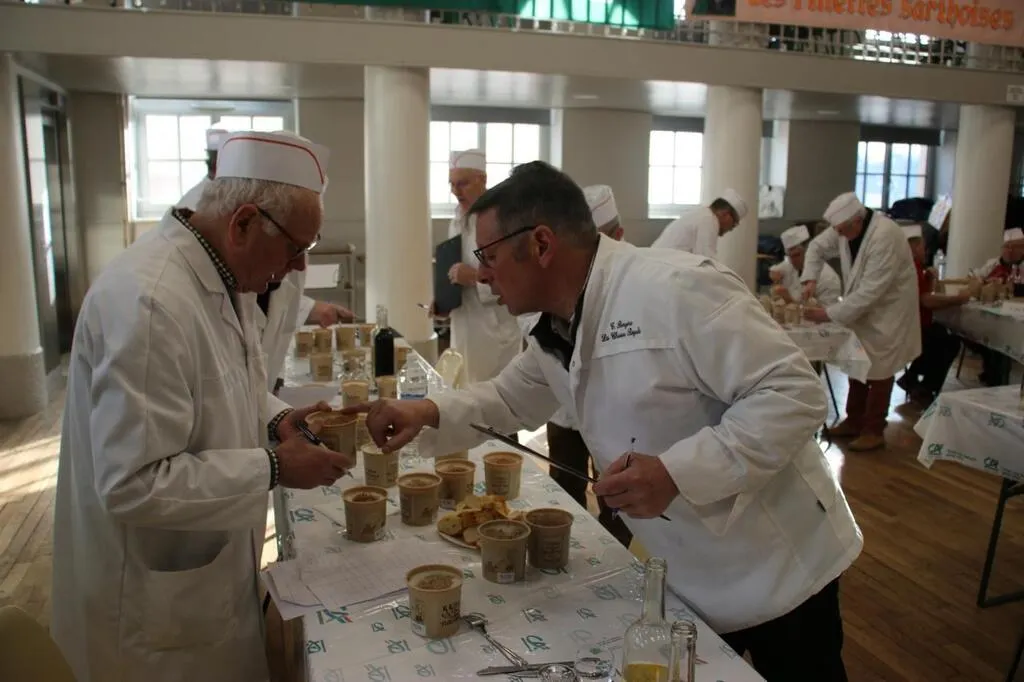 Une trentaine de professionnels étaient réunis à Mamers (Sarthe) pour désigner le meilleur pot de rillettes au concours national de la fabrication des rillettes sarthoises, samedi 11 février 2023. © Ouest-France