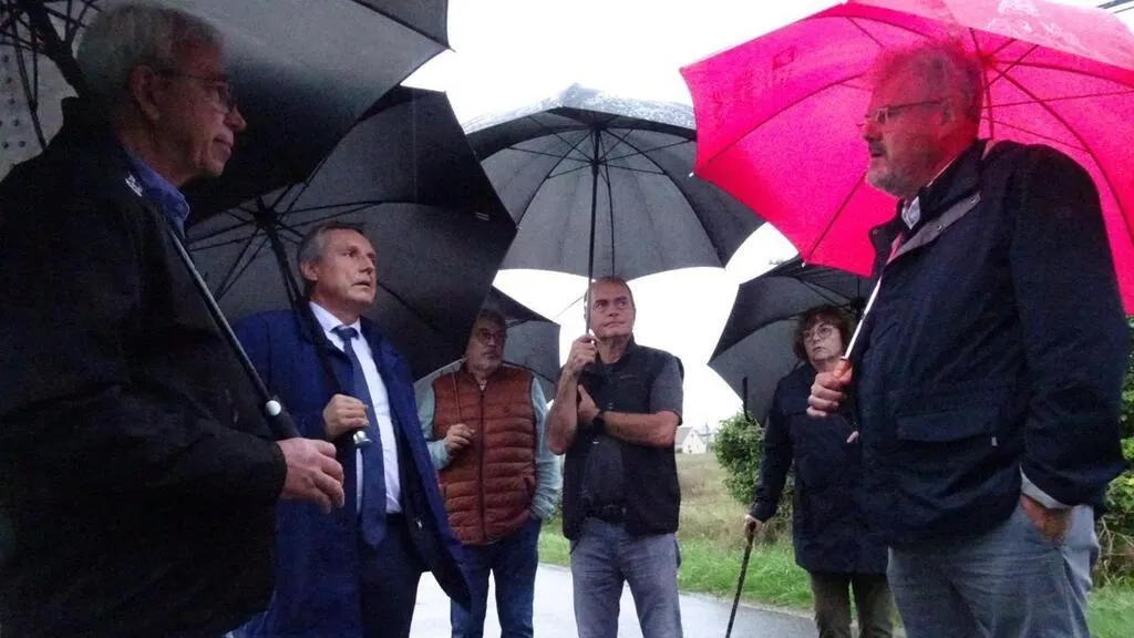 Le projet de lotissement de Nexity, route de l’Arpent à Coulaines (Sarthe), a été au centre de la discussion entre Christophe Rouillon, le maire, et Franck Vallée (parapluie rouge) devant trois autres riverains et un adjoint. © Ouest-France