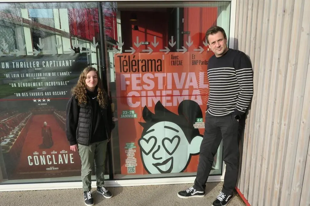 Manon Godet, employée, aux côtés de Vincent Thibault, le directeur du cinéma Confluences de Sablé-sur-Sarthe, pose près de l’affiche du festival cinéma Télérama du 22 au 28 janvier prochain. © Ouest-France