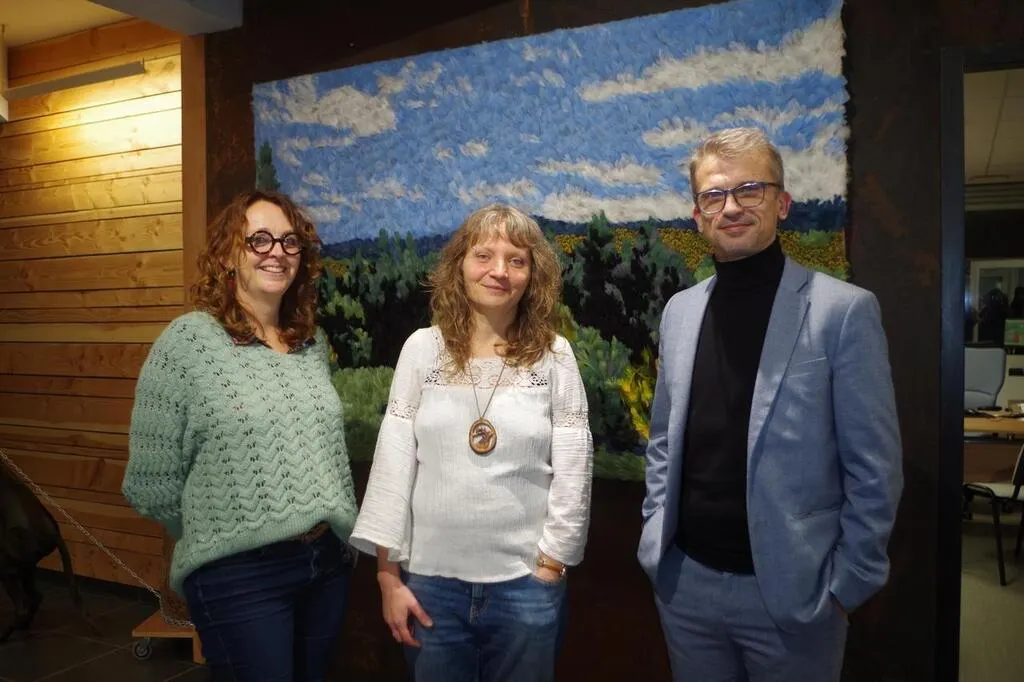 Katarina Kudelova, entourée de Céline Chiron, professeur d’arts plastiques et de Julien Frenal, principal du collège. © Le Maine Libre