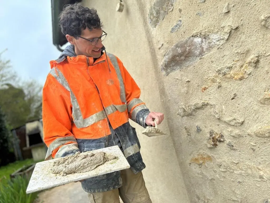 Julien Gillet enduit à la chaux le mur d’une maison. © Ouest-France
