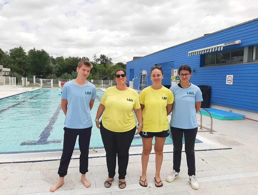 L’équipe de la base aqualudique de Loué avec de g. à dr : Kévin agent d’accueil, Tiphanie maître-nageuse, Camille BNSSA et Chloé agent d’accueil. © Le Maine Libre