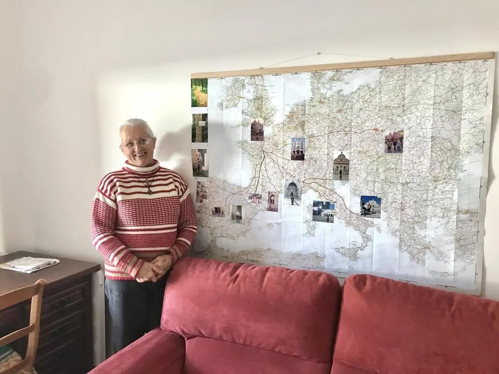 Monique Chanteau présente sa carte de pèlerinages européens, au nombre de 12. © Ouest-France