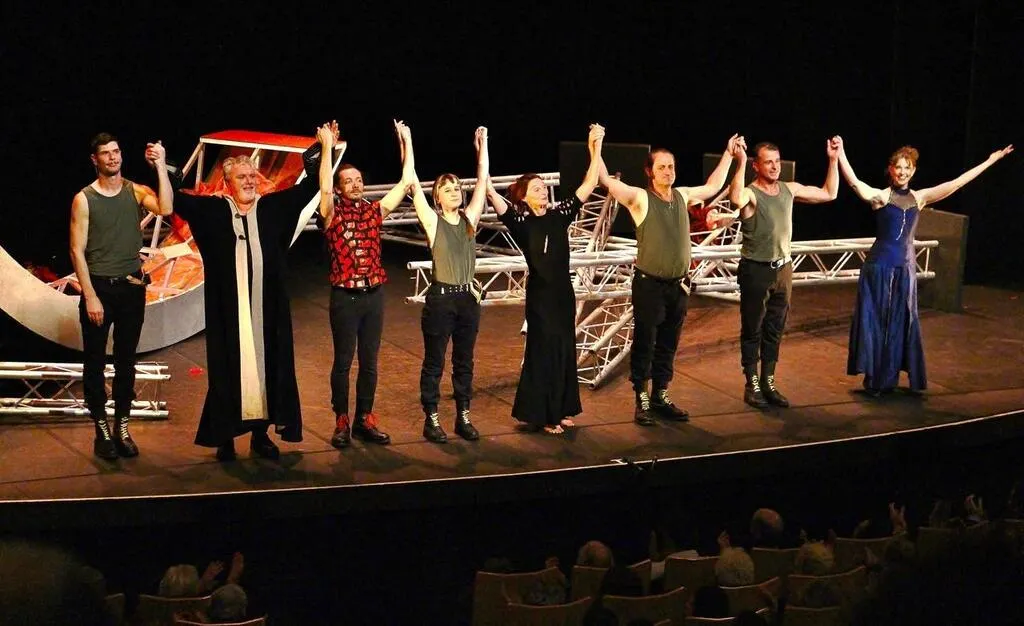 L’équipe de La Houlala Compagnie lors du salut pour la première du spectacle « Lucrèce Borgia », sur la scène Joël-Le Theule, à Sablé-sur-Sarthe, en novembre 2023. © L’Entracte, Sablé-sur-Sarthe