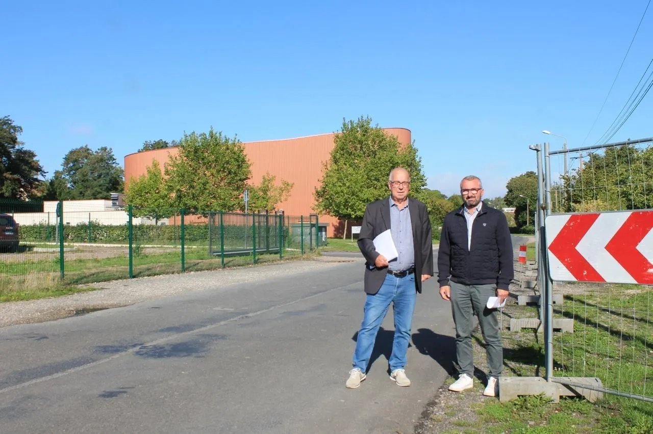 Gérard Evrard et David Paysan devant la rue qui sera barrée à partir du 22 septembre. © Le Maine Libre