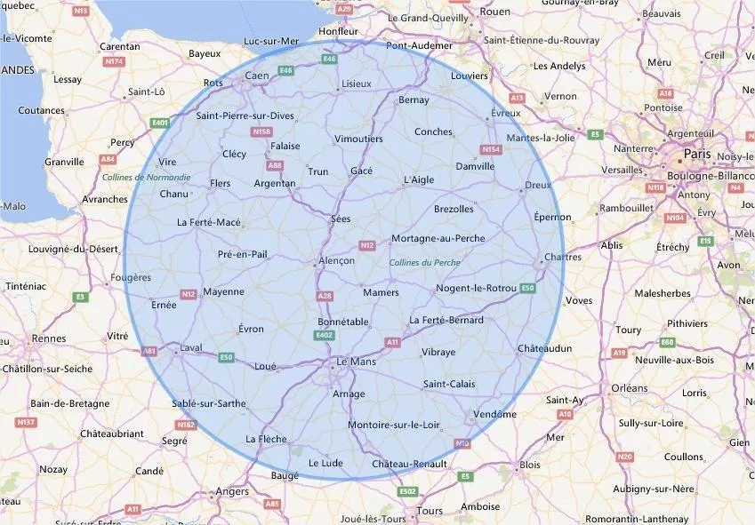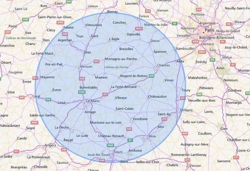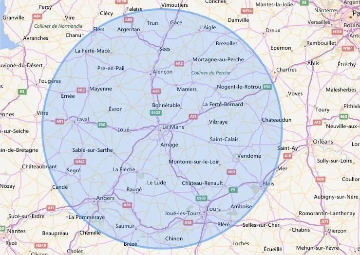 Depuis La Ferté-Bernard, voilà le périmètre de cent kilomètres autorisé. © Capture d’écran Calc maps.