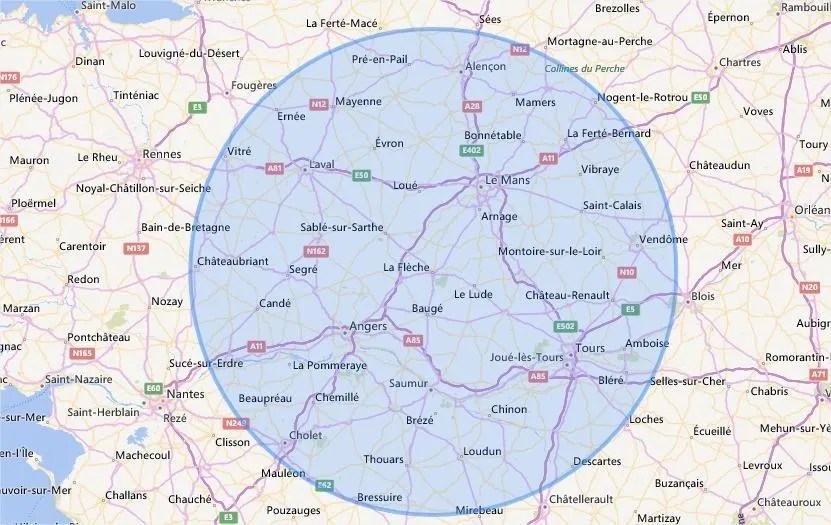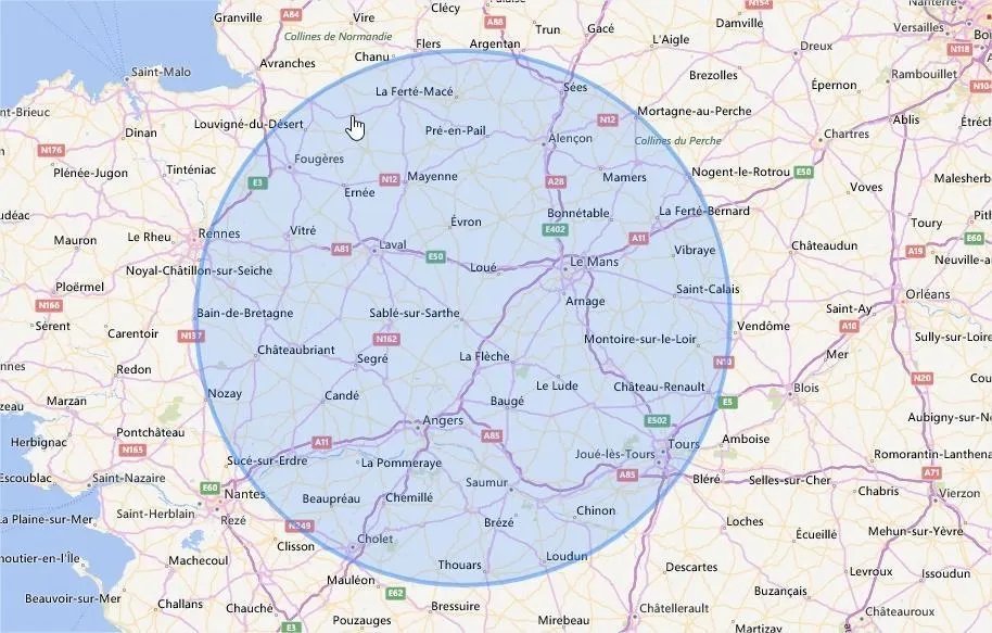Un cercle de 100 kilomètres autour de Sablé, voilà à quoi cela ressemble. © Capture d’écran Calc maps.