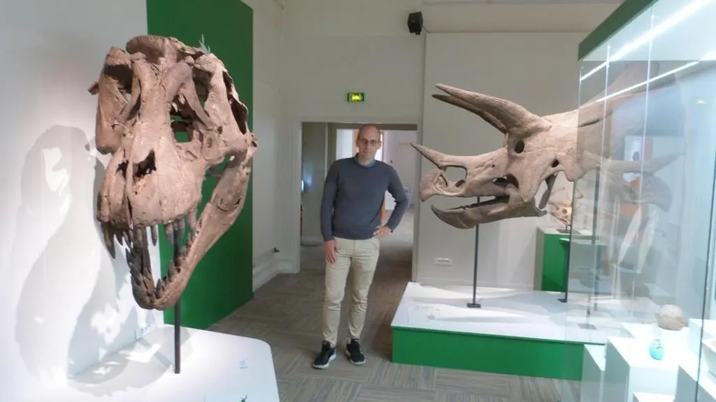 Nicolas Morel, commissaire de l’exposition Géants, au temps des dinosaures et les crânes d’un T-rex et d’un tricératops Archives Ouest-France