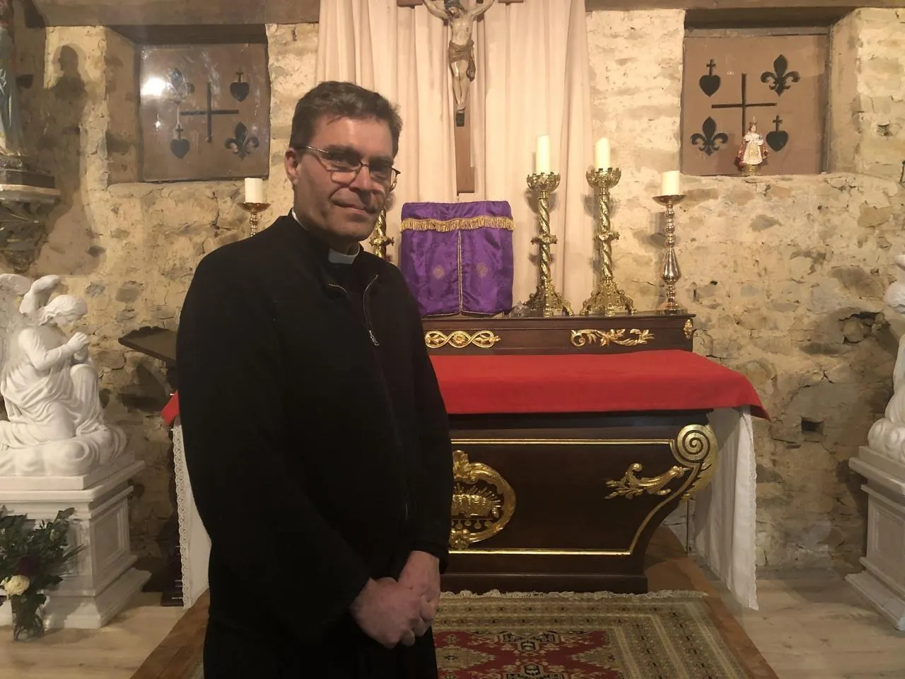 L’abbé Matthieu Salenave, dans sa chapelle qui fait partie de sa propriété, à Saint-Aignan-sur-Roë (Mayenne). © Archive OF