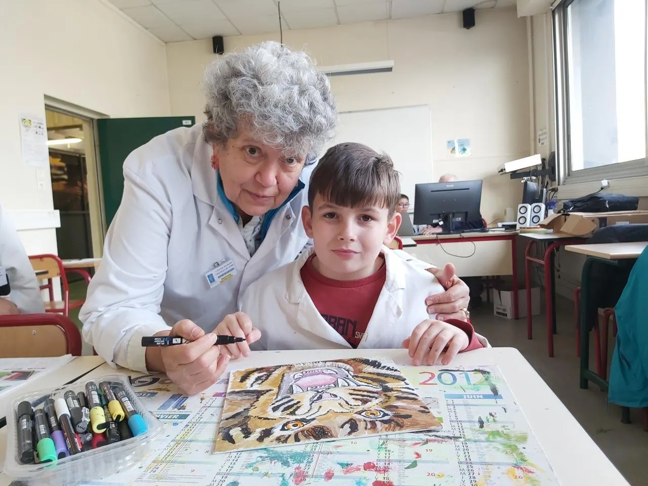Anne Quievreux, animatrice de l’atelier peinture décorative, et Louizon, l’un des élèves © Le Maine Libre