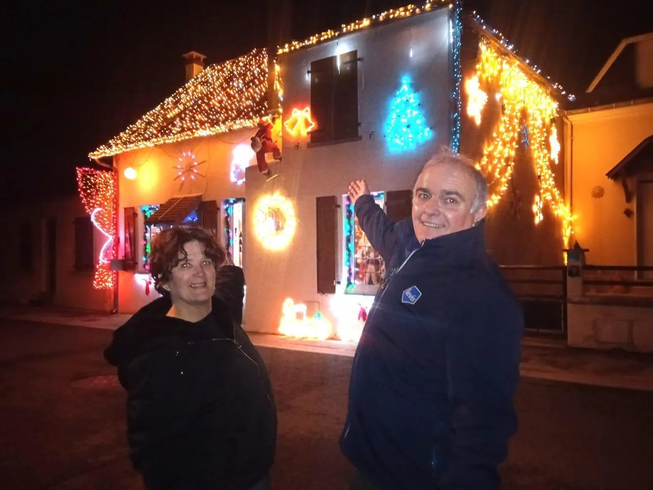 Sandra et Stéphane Jacquet devant leur belle maison illuminée. © Le Maine Libre