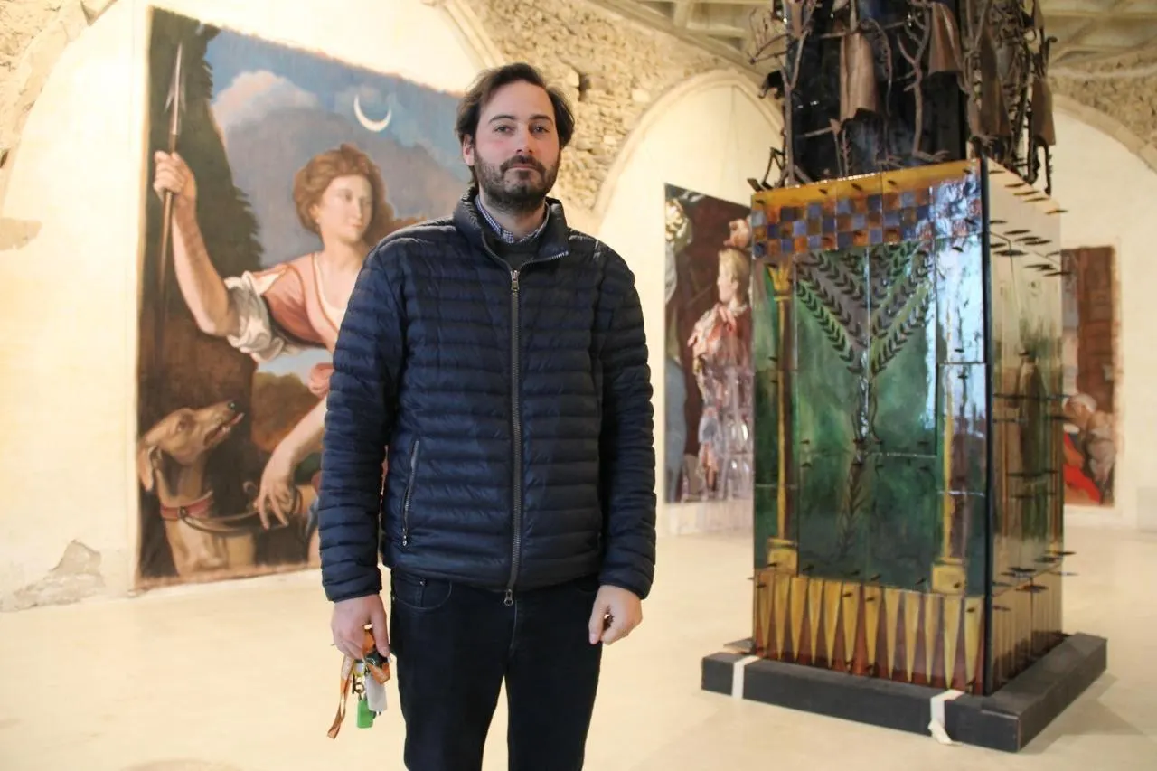Lancelot Durand, gestionnaire du prieuré de Vivoin (Sarthe), ici devant une Å“uvre monumentale du peintre-sculpteur Gérard Garouste. Le lieu accueille des événements privés, mais aussi un festival de musique classique. Et des expositions temporaires. © Archives Ouest-France