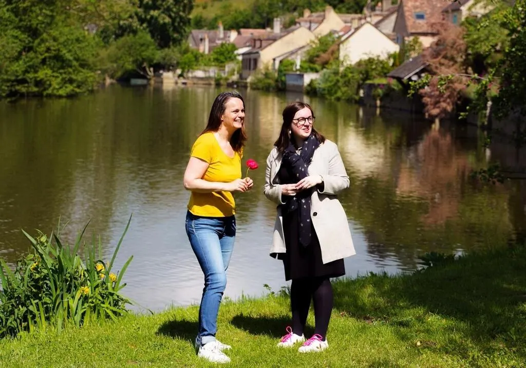 La blogueuse Chantille de Lincourt (à gauche), accompagnée de Lauréna Salion, chargée de patrimoine à Fresnay-sur-Sarthe, lors de sa visite de la ville. © Chantille de Lincourt