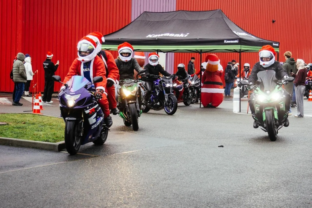 Ils ont troqué les traîneaux pour des deux roues. 180 motos chevauchées par des motards déguisés en Père Noël ont bravé la pluie pour la parade des Pères Noël au départ de Ruaudin (Sarthe), près du Mans, ce samedi 29 novembre 2025.