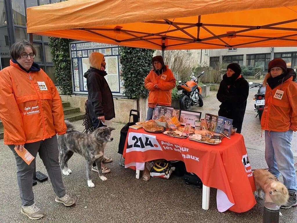 L’association L214 proposait des dégustations de produits végétaux, samedi 4 janvier 2025, au Mans (Sarthe). © Ouest-France