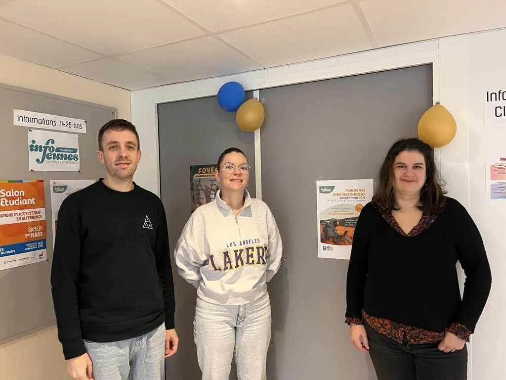 Thomas Bauvais, Sarah Bompard et Stéphanie Guy en charge du forum des jobs saisonniers organisé par l’Info jeunes et la Mission locale, le samedi 1er mars 2025 à l’espace Gambetta de La Flèche (Sarthe). © Ouest-France.