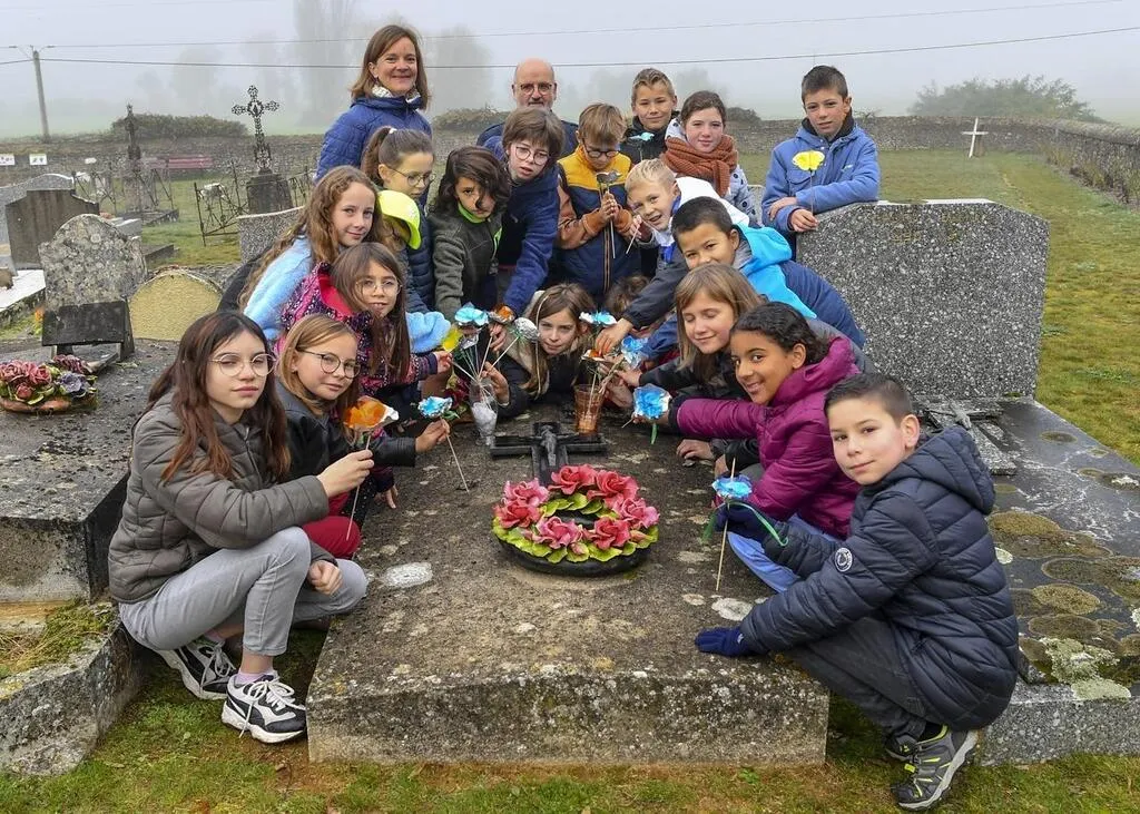 Beaufay, jeudi 10 novembre 2022. Accompagnés par Yves Moreau et Laëtitia Dorne, leur professeure des écoles, les élèves de CM2 ont déposé des fleurs en papier sur la tombe de Léontine Bracchi, qui a caché à Beaufay deux enfants juifs en 1944. © Le Maine Libre – Yvon LOUÉ