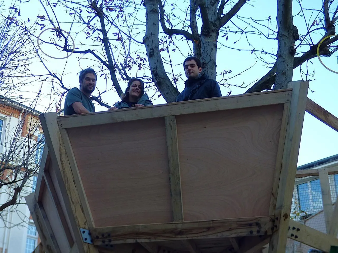 Antoine Juvin pour la menuiserie, Stéphanie Rodriguez pour la mairie de Paris, cliente, et Lorenzo Majer, l’architecte, dans la cabane en bois, fruit de leur collaboration, fabriquée au Bailleul et installée dans une école parisienne. © Ouest-France