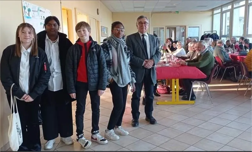 Manon, Shinar, Hugo, Sébastina avec le maire de Montreuil-le-Henri Alain Chevallier (debout), lors du repas des anciens de Montreuil-le-Henri. © Le Maine Libre