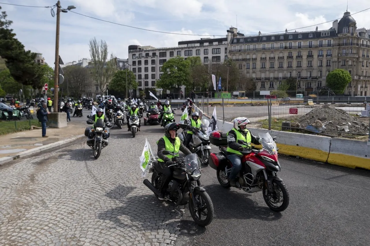 Des motards manifestent à Paris contre l’instauration du contrôle technique pour les deux roues, le 23 avril 2023. Photo d’illustration. © SERGE TENANI / Hans Lucas via AFP