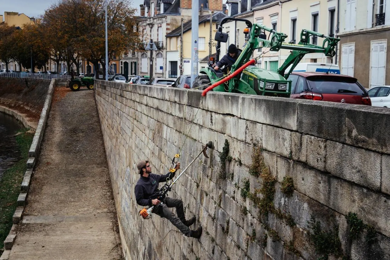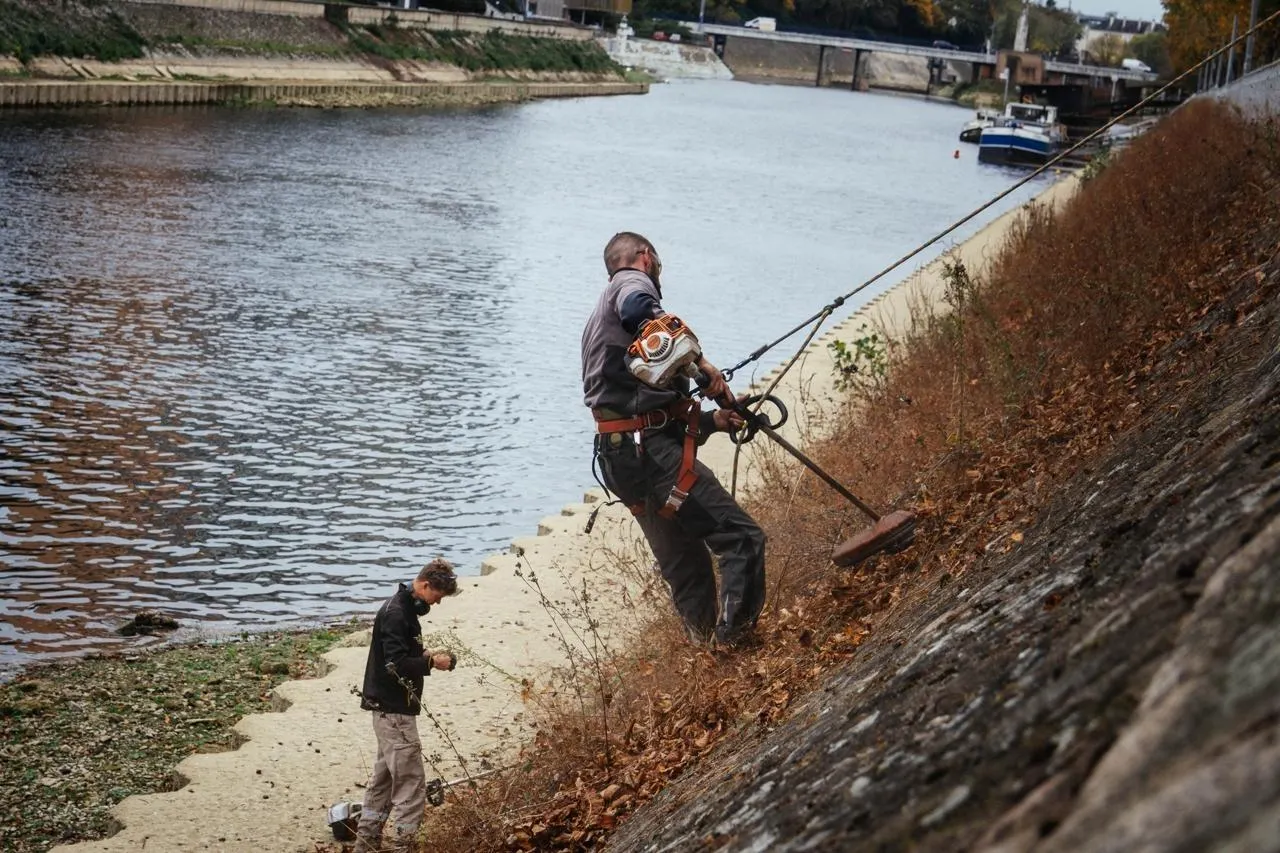 Le nettoyage annuel des bords de la Sarthe a lieu en ce moment au Mans (Sarthe). Pour procéder à ces travaux qui devraient encore durer jusqu’à mi-novembre 2025, les ouvriers se suspendent afin de débroussailler les surfaces verticales.