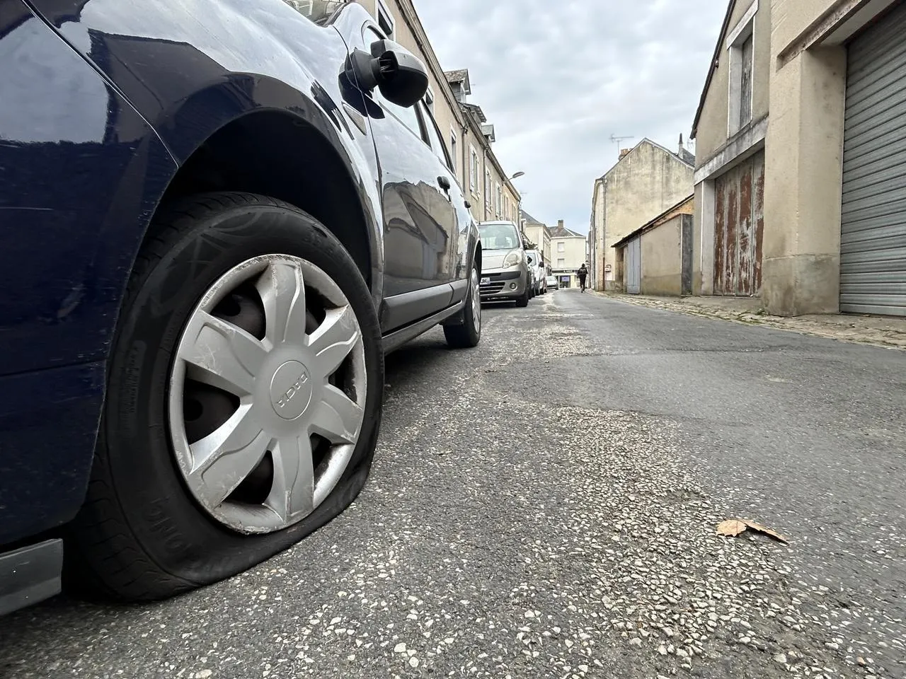 Un peu après midi, ce mercredi 5 novembre 2025, plusieurs véhicules été encore à plat dans le centre-ville de La Flèche (Sarthe), touché par des crevaisons en série. © Ouest-France