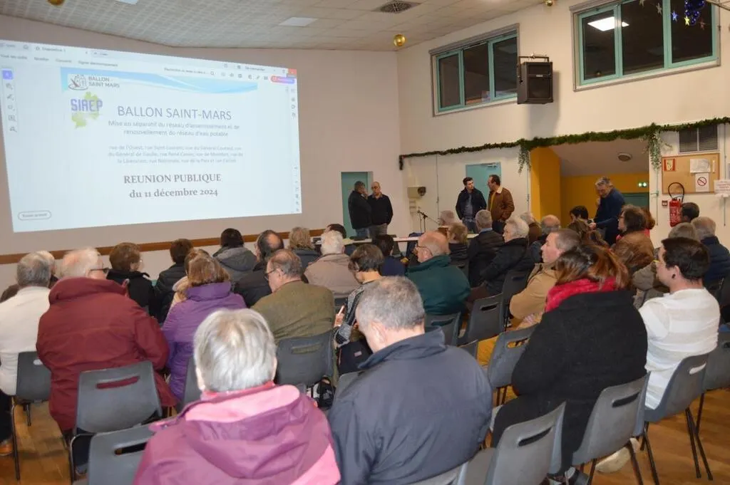 La salle Michel Lalos de Ballon-Saint-Mars (Sarthe) accueillait, mercredi 11 décembre 2024, une réunion d’information sur les travaux de restructuration du réseau d’assainissement et du renouvellement du réseau d’eau potable du bourg.
