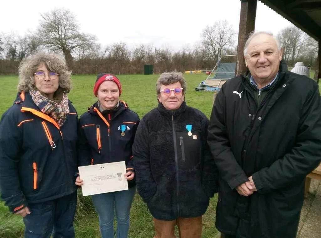 Audrey Badouard et Patricia Sigogne ont reçu la médaille de bronze ministérielle de la Jeunesse, des sports et de l’engagement associatif des mains de René Brugger (à droite) pour le plus grand plaisir de Frédérique Ortiz (à gauche), présidente du club Sport canin sabolien. © Ouest-France
